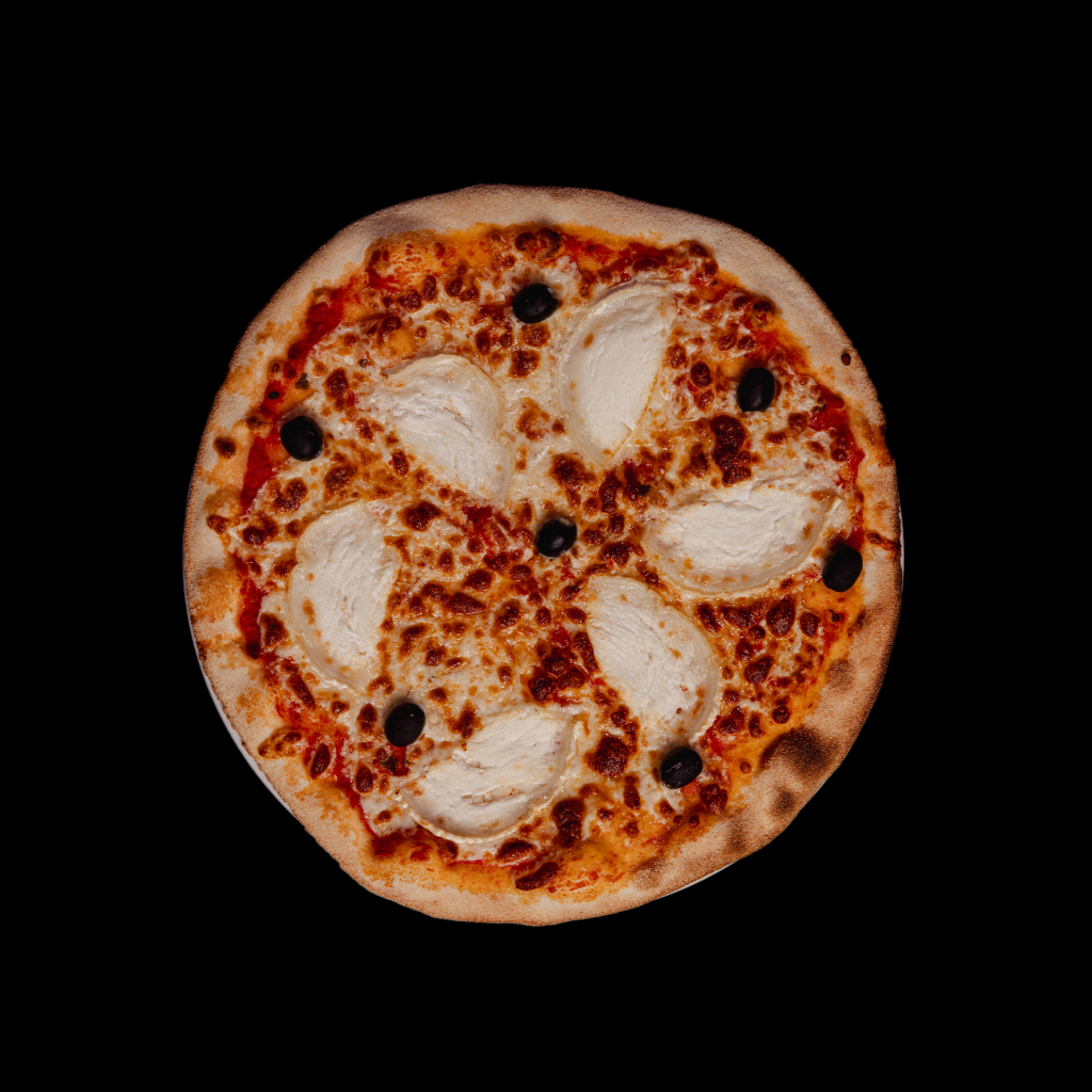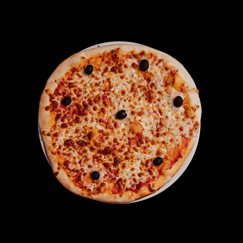 Base crème, mozzarella, emmental, gorgonzola, chèvre, parmesan, olives