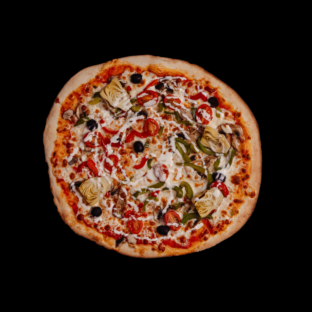 Base tomate, poivrons, artichauts, tomates fraîches, champignons, mozzarella, crème fraîche, olives