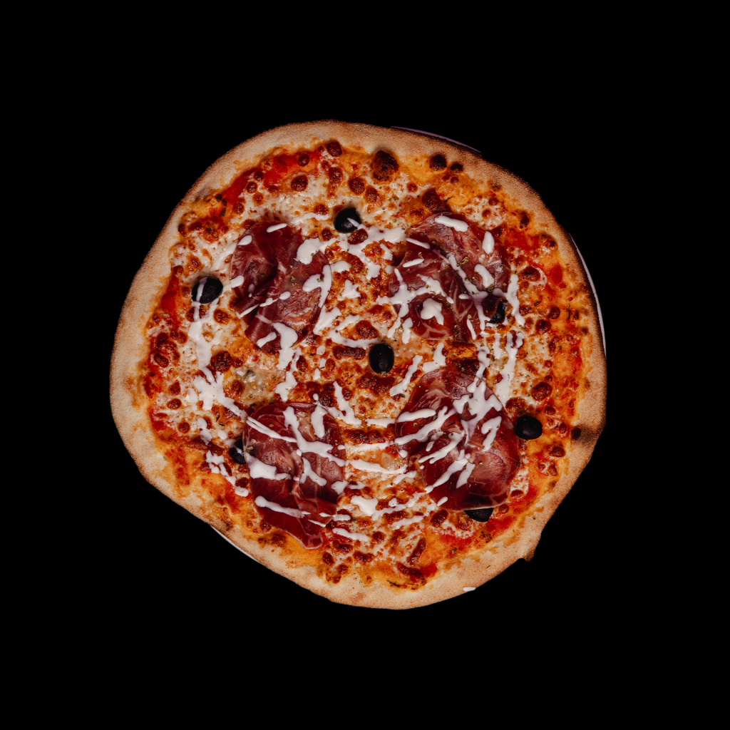 Base tomate, gorgonzola, coppa, mozzarella, crème fraîche, olives, origan