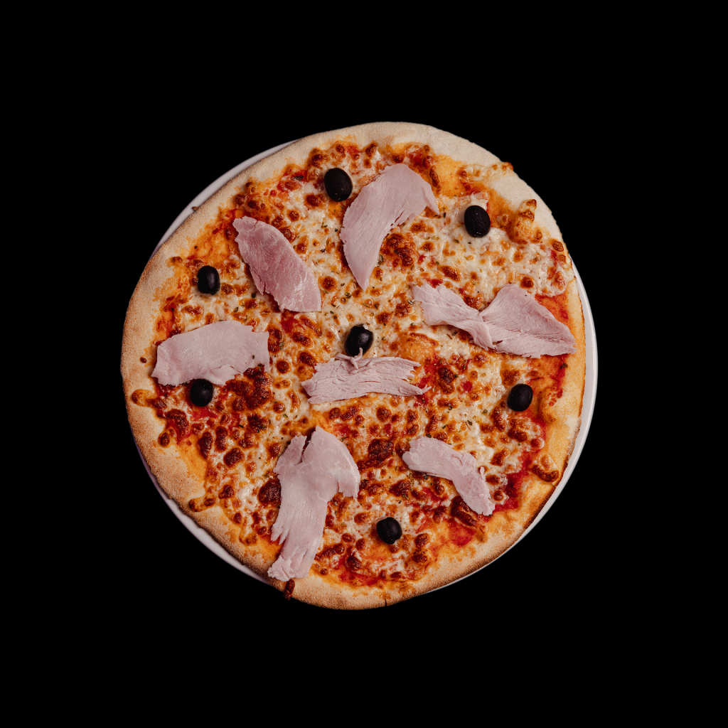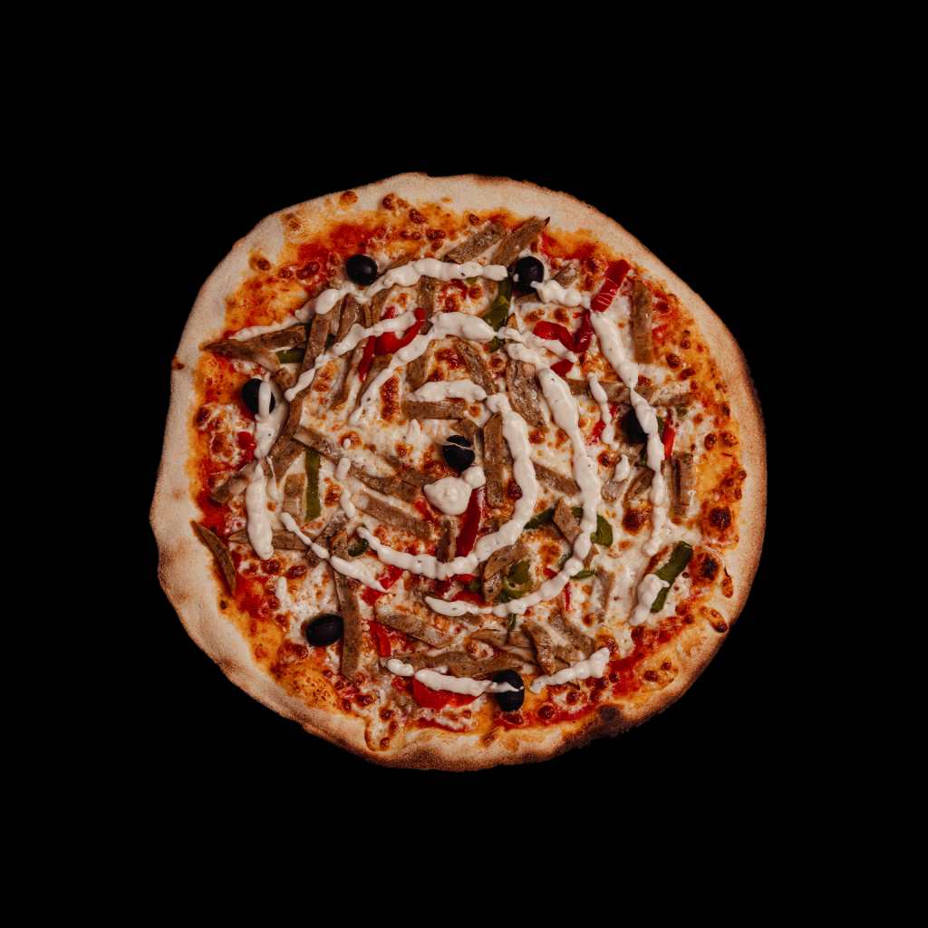 Base tomate, poivrons, oignons, viande kebab, mozzarella, sauce kebab, olives