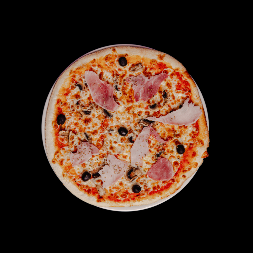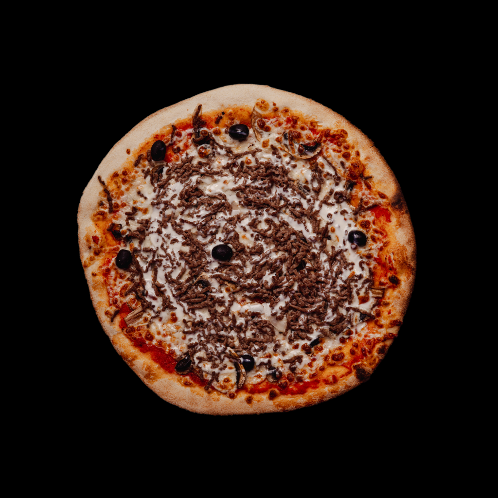 Base tomate, oignons, champignons, viande hachée, mozzarella, crème fraîche, olives
