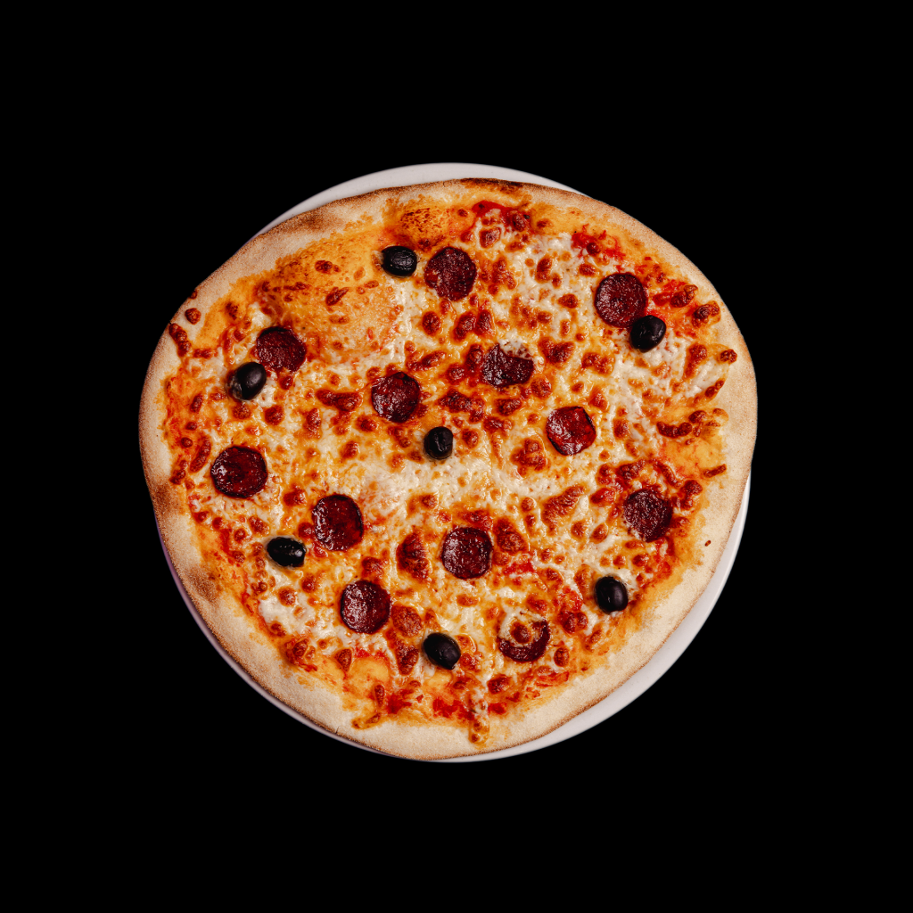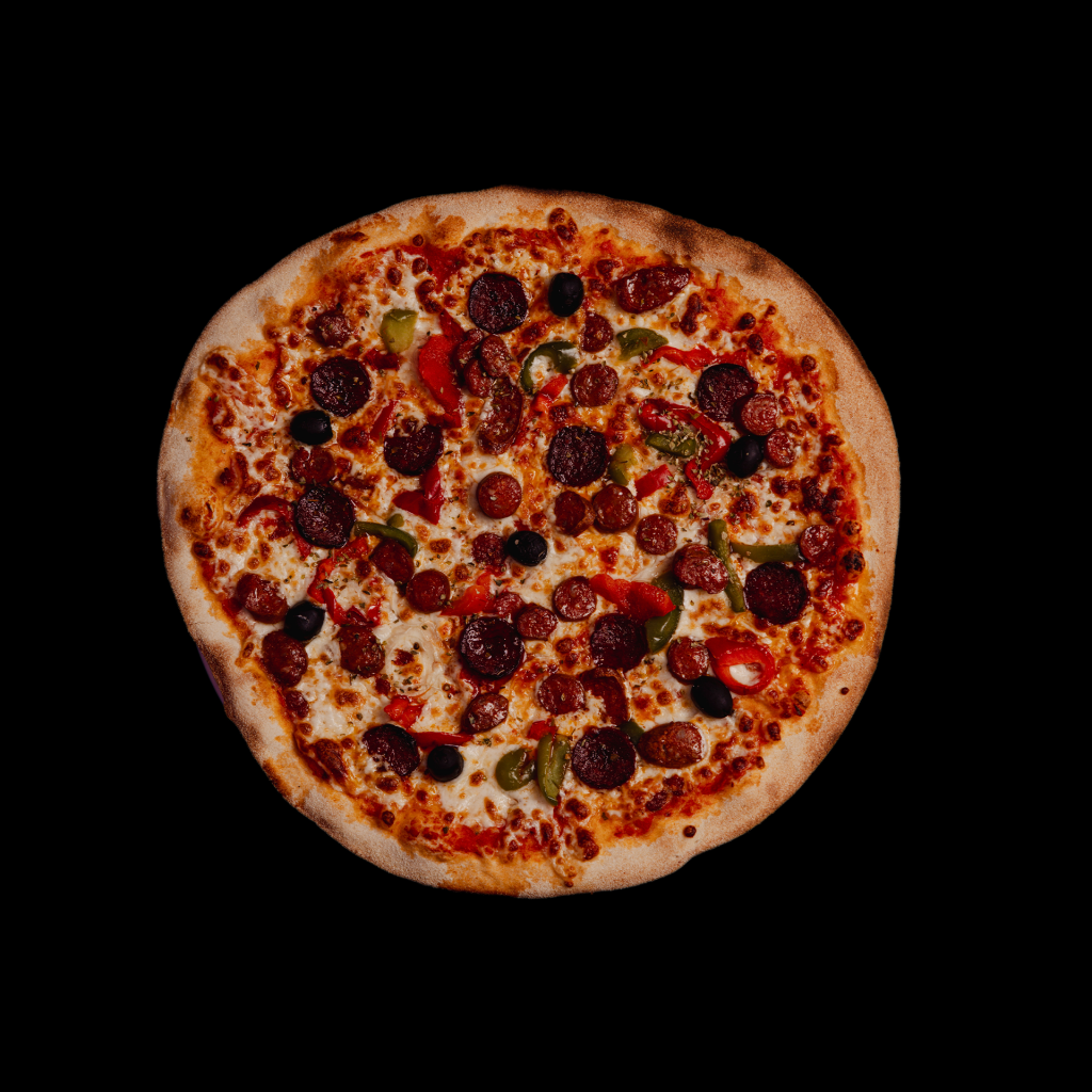 Base tomate, poivrons, oignons, merguez, chorizo, mozzarella, olives, origan